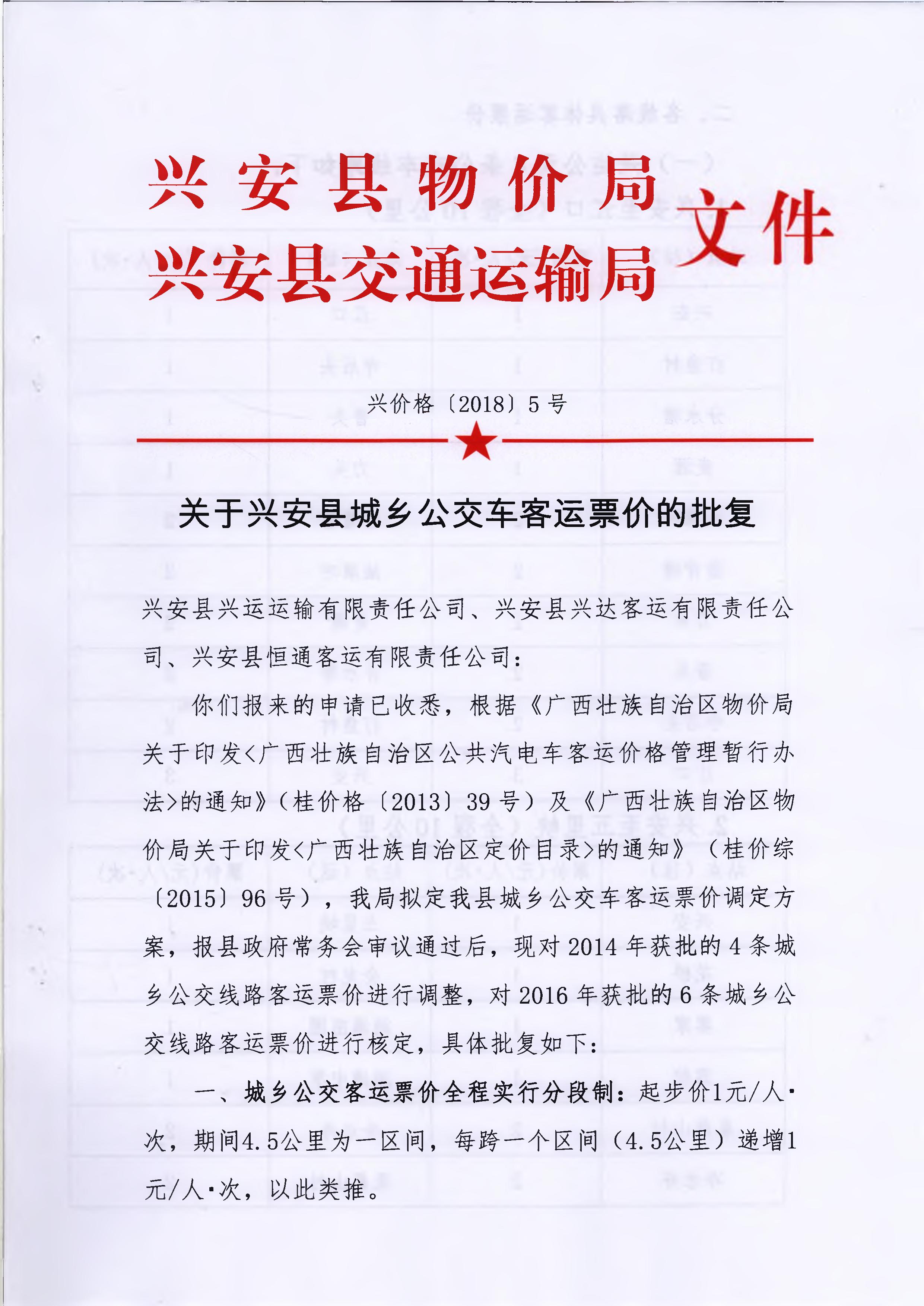 [物价局]关于兴安县城乡公交车客运票价的批复