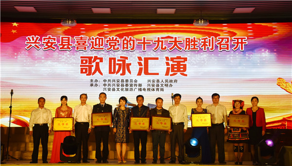 汇演前,县委书记黄洪斌作了热情洋溢的致辞,他说:党这奋进的五年,真切让我们感受到了我们伟大的民族复兴的光荣,过去的五年也是兴安发展极不平凡的五年,更是兴安发展奋进的五年。今天我们站在了新的历史起点上,每一代人有每一代人的长征路,党的十九大胜利召开开启了我们中华民族努力实现中国特色主义的新时代,我们将不忘初心,牢记使命,决战小康,走向复兴,创造辉煌,我们将紧密地团结在以习近平同志为核心的党中央周围同心同力克难攻坚,围绕“三大兴安”、“七大目标”而努力奋斗,共同开创兴安二次创业的新征程。